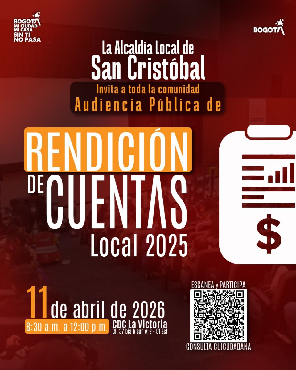 Afiche de la Alcaldía Local de San Cristóbal que invita a la Rendición de Cuentas Local 2025 el 11 de abril de 2026 en el CDC La Victoria.
