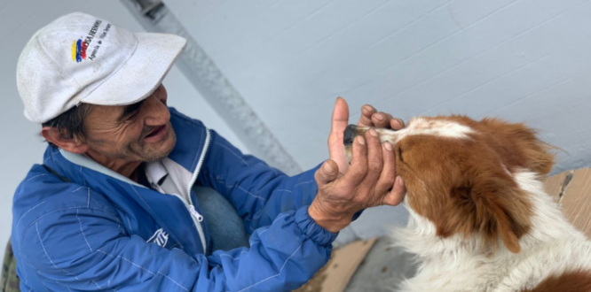 Bogotá, 05 de agosto de 2022. Pocas imágenes son más tradicionales en el panorama bogotano que la del habitante de calle y su perro: compañeros inseparables, unidos por la casualidad derivada del trasegar diario por las atestadas avenidas y cuadras capitalinas. Muchos creen que ese perro o gato que sigue insistentemente al infortunado parroquiano es en realidad su ángel de la guarda encarnado, con pulgas y todo.