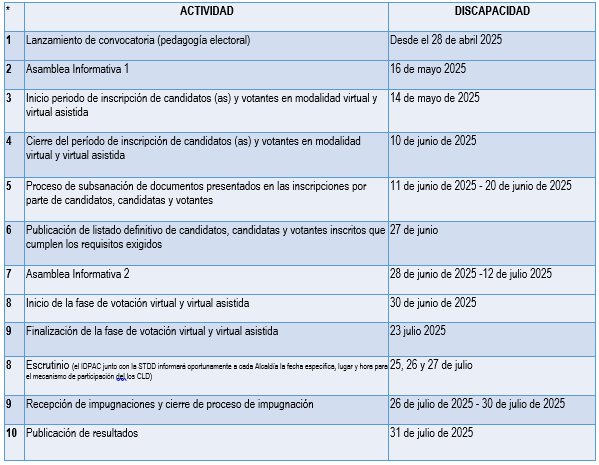El cronograma definido para adelantar el proceso de elección de los representantes a los Consejos Locales de Discapacidad para la localidad de San Cristóbal es: