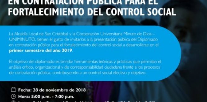 La Alcaldía Local de San Cristóbal, comprometida con los ejercicios de control social. Disponemos de 200 cupos para que se inscriban. ¡No pierdas esta oportunidad!Te invitamos a la presentación pública del diplomado en contratación pública para el fortalecimiento del control social.