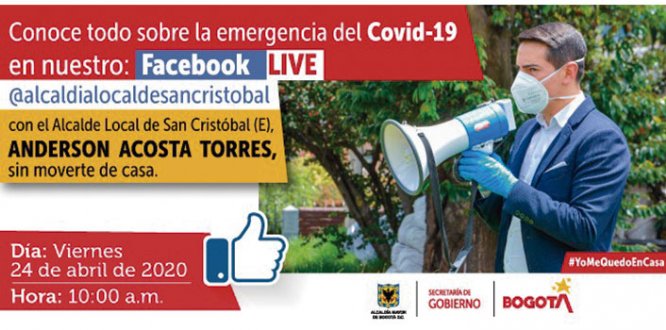 Así mismo, durante el tiempo que dure la transmisión en el Facebook oficial de la Alcaldía Local de San Cristóbal, el mandatario realizará una introducción de su perfil y presentará la creación de la gerencia de atención a la pandemia Covid-19.