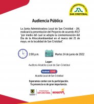 Haz parte de esta audiencia pública liderada por la JAL San Cristóbal. ¡Te esperamos!