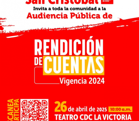 Acompáñanos este 26 de abril a las 10:00 a.m. en el Teatro CDC La Victoria para la Audiencia Pública de Rendición de Cuentas 2024 de la Alcaldía Local de San Cristóbal.