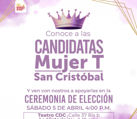 Este sábado 5 de abril, vive la emoción de la Ceremonia de Elección y Coronación Mujer T, un evento lleno de orgullo, diversidad y reconocimiento, donde celebraremos a mujeres que brillan con luz propia.