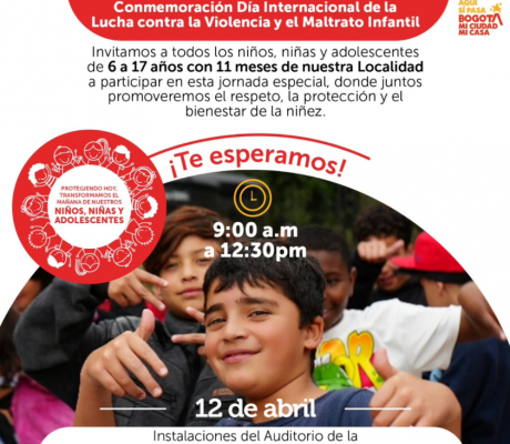 Este 12 de abril te esperamos de 9:00 a.m. a 12:30 p.m. en el Auditorio de la Alcaldía Local de San Cristóbal para conmemorar el Día Internacional de la Lucha contra la Violencia y el Maltrato Infantil.