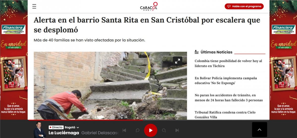 “Un proceso de socavación sobre unas escaleras ubicadas en el barrio Santa Rita. La escalera ya venía con una afectación y por las fuertes lluvias se presentó este desprendimiento de una parte material. Empezaron a fracturarse lo cual provoca un manejo complejo de la movilidad”, afirmó Juan Sebastián Rodríguez funcionario del Instituto Distrital de Gestión de Riesgos y Cambio Climático (Idiger).