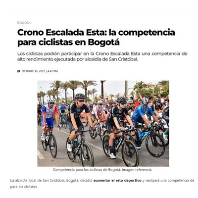 La Crono Escalada Esta es una competencia de alto rendimiento y pondrá a prueba a los ciclistas bogotanos en una empinada ruta de 4.8 kilómetros, que atravesará gran parte de la zona alta de la localidad.