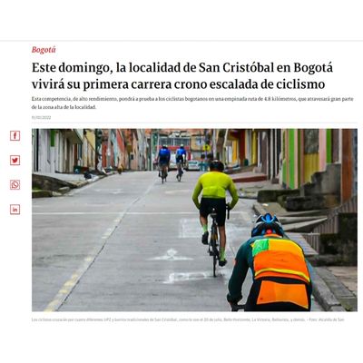 Luego del éxito que tuvo el regreso de la “Clásica Ciclística del 20 de Julio”, la alcaldía local de San Cristóbal decidió subir la apuesta deportiva. De esta manera, el próximo domingo 16 de octubre, desde las 7:00 a.m. y hasta la 1:00 p.m. se llevará a cabo la crono escalada 2022.