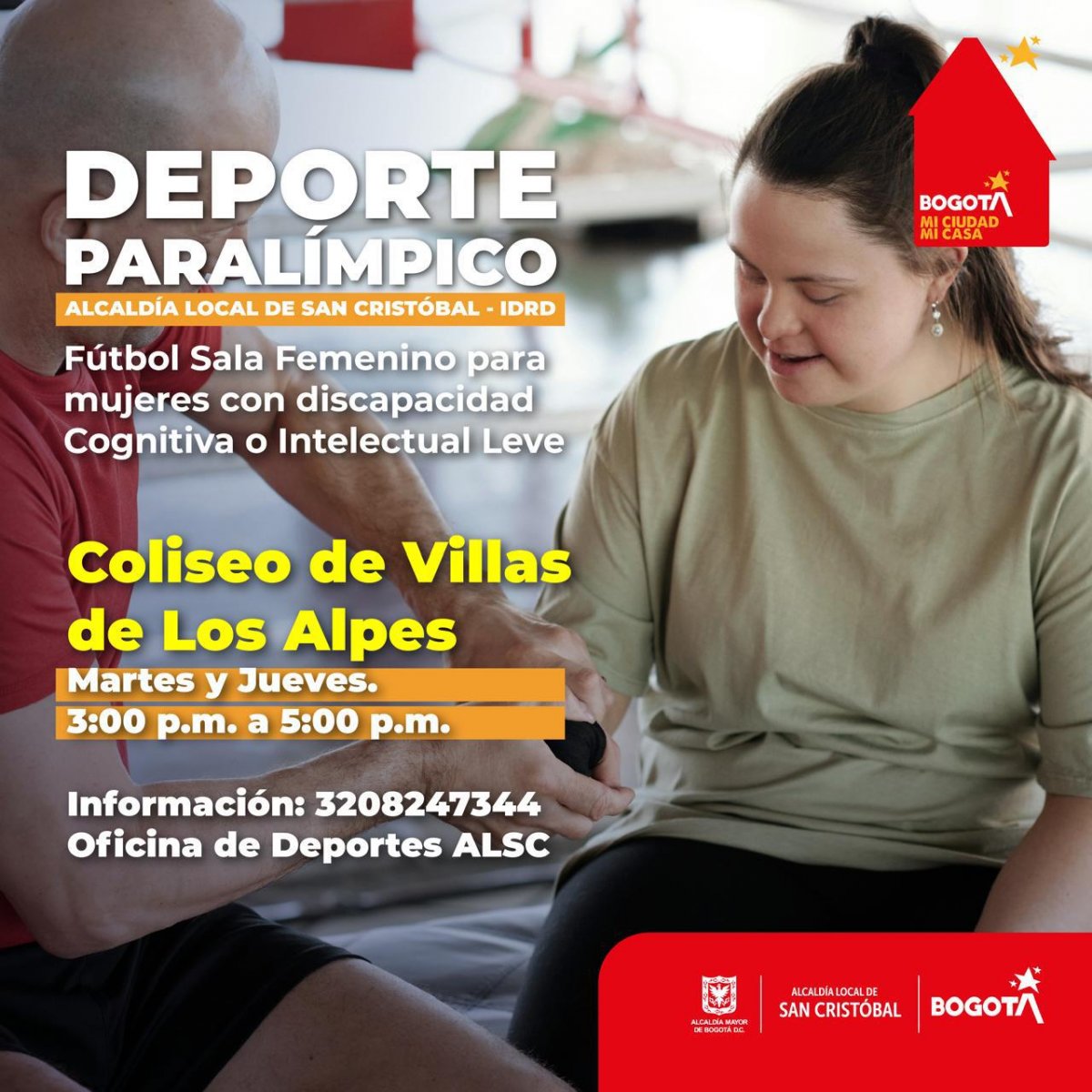 ¡Fútbol Sala Femenino Paralímpico! Si eres mujer con discapacidad cognitiva o intelectual leve, te invitamos a nuestra Escuela de Formación, un programa permanente que inicia el 23 de enero de 2025 en el Coliseo de Villas de los Alpes.