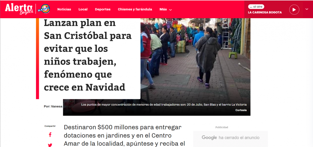 Según las indagaciones de la alcaldía local, los puntos de mayor concentración de menores de edad trabajadores son: 20 de Julio, San Blas y el barrio La Victoria, los cuales tienen en común su alto movimiento comercial en estas fiestas decembrinas.