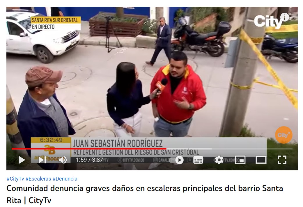 La comunidad del barrio Santa Rita de la localidad de San Cristóbal realiza una denuncia ciudadana a causa de que la escalera principal del sector presenta graves daños, lo que se ha convertido en un gran riesgo para la ciudadanía y los adultos mayores. Así las cosas, los habitantes de este punto solicitan una pronta intervención de las autoridades.