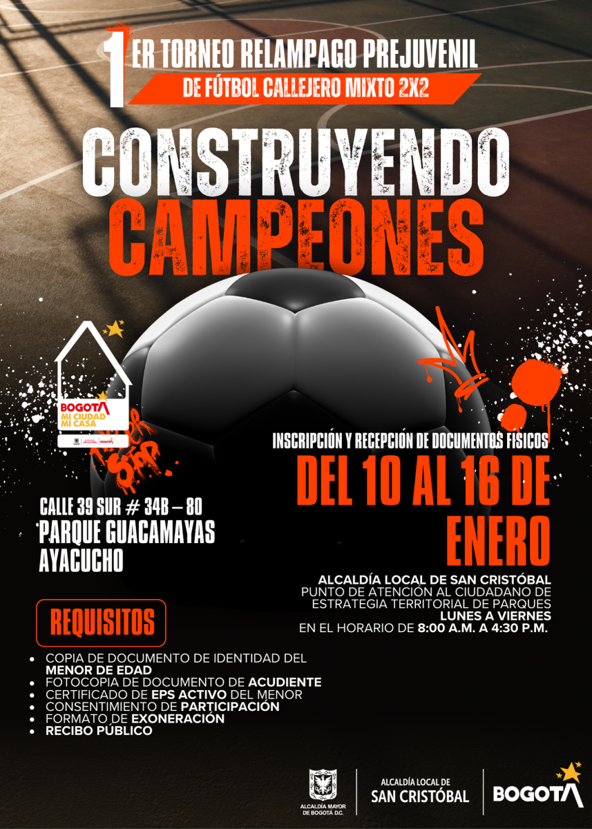 ¡Únete al 1er Torneo Relámpago Prejuvenil de Fútbol Callejero Mixto 2x2 en Bogotá! Una oportunidad increíble para demostrar tus habilidades, disfrutar del deporte y construir momentos inolvidables. Inscribe tu equipo del 10 al 16 de enero en cualquiera de las dos sedes: Parque Guacamayas o Parque Marbella.