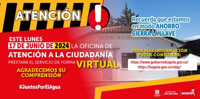 Teniendo en cuenta la importancia de la prestación del servicio a los ciudadanos en su localidad, el próximo lunes 17 de junio de 2024 se garantizará una adecuada atención a la ciudadanía de manera VIRTUAL cumpliendo el horario establecido. Los canales dispuestos para consulta y atención ciudadana son: la página Web de la Secretaria Distrital de Gobierno, la Ventanilla Virtual y el Sistema Distrital para la Gestión de Peticiones Ciudadanas Bogotá te escucha, accediendo al siguiente link: https://www.gobiernobogota.gov.co/
