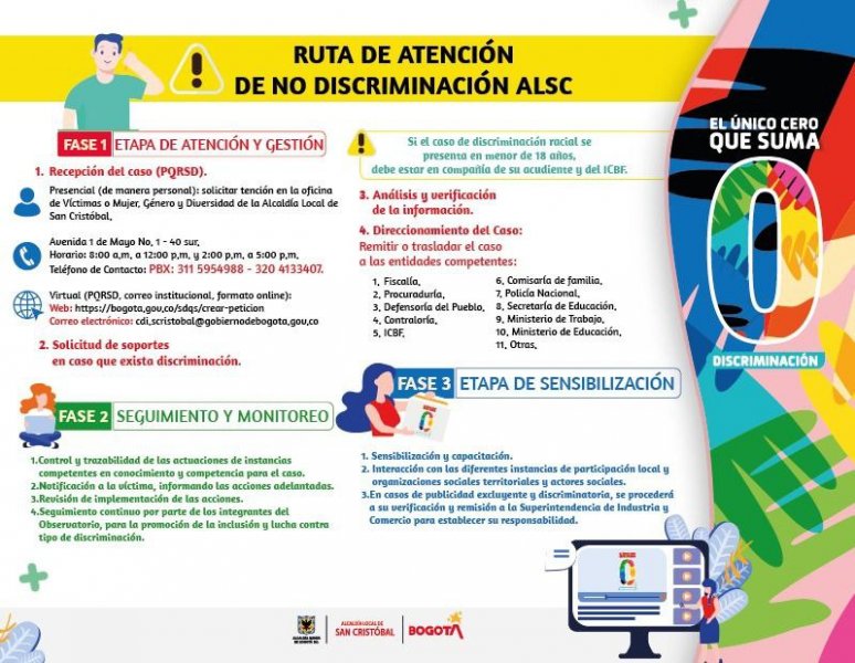Desde la Alcaldía Local de San Cristóbal buscamos garantizar la No Disrciminación en nuestro territorio, por este motivo hemos realizado una ruta de atención para garantizar que nuestra ciudadanía conozca el protocolo a seguir.